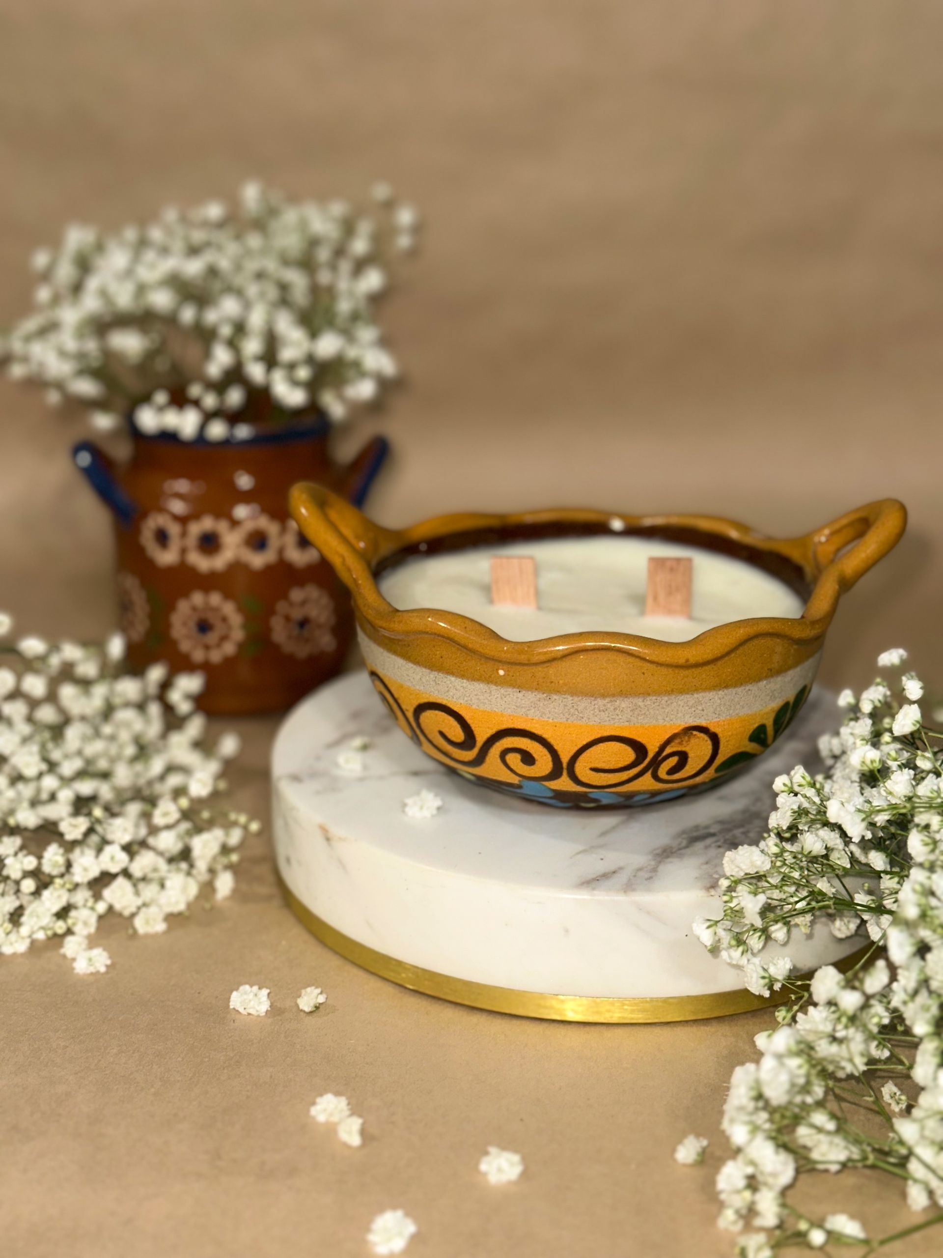 Indulge your senses with the rich aroma of Vaquero in our soy candle, hand-poured in San Antonio, Texas. Housed in a beautiful white and orange jarrito handcrafted by skilled Mexican artisans, this candle combines authentic craftsmanship with the comforting scent of Vaquero. Perfect for creating a warm and inviting ambiance in any space.